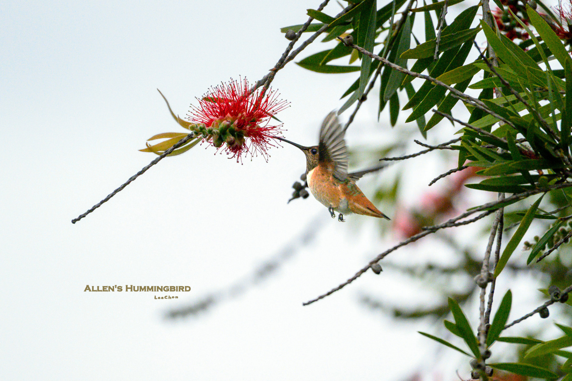 이 사진의 벌새는 Allen's Hummingbird (앨런벌새) 암컷 또는 미성숙 수컷으로 보입니다.