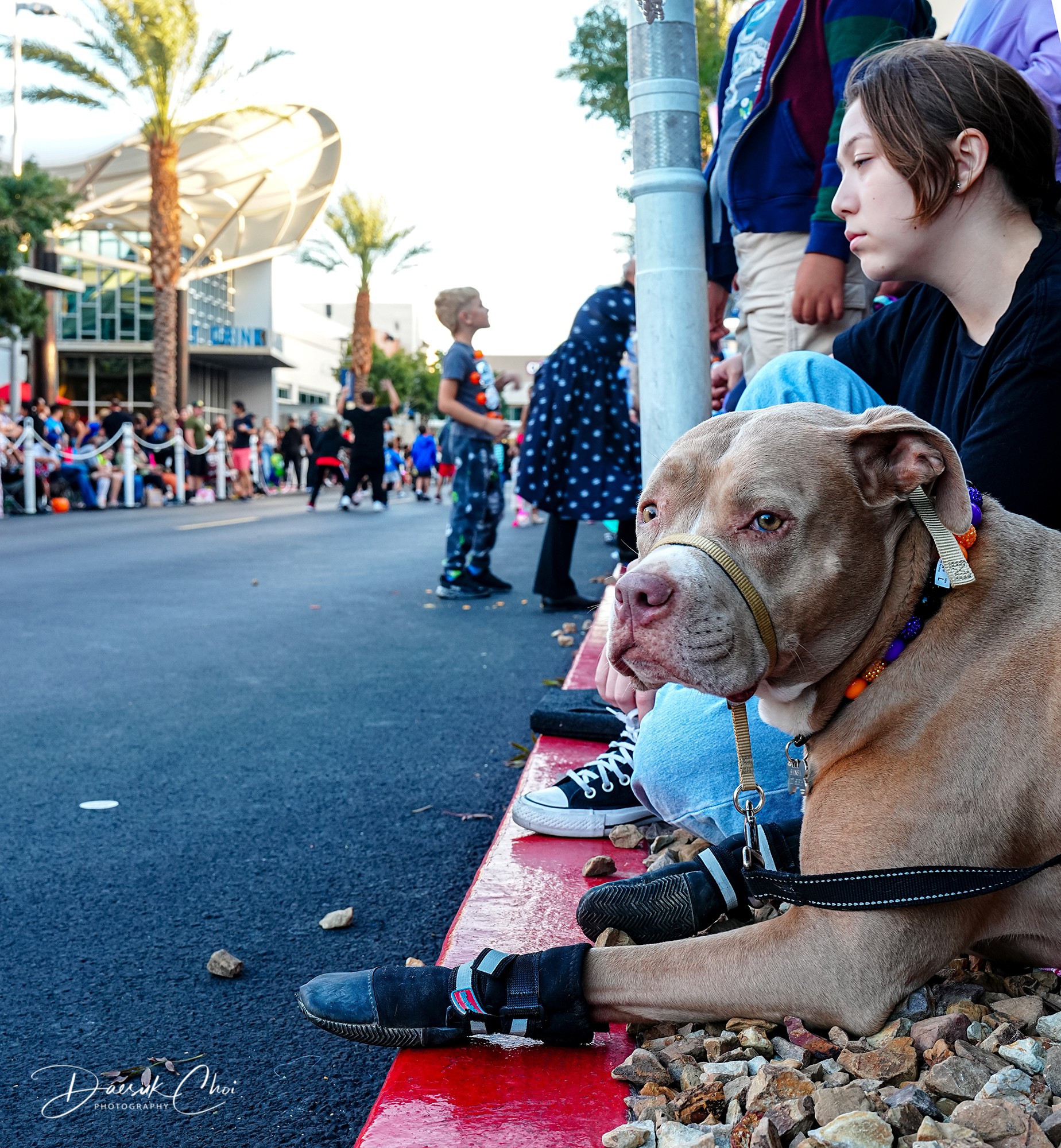할로윈 퍼레이드를 기다리고 있는 사람과 개...