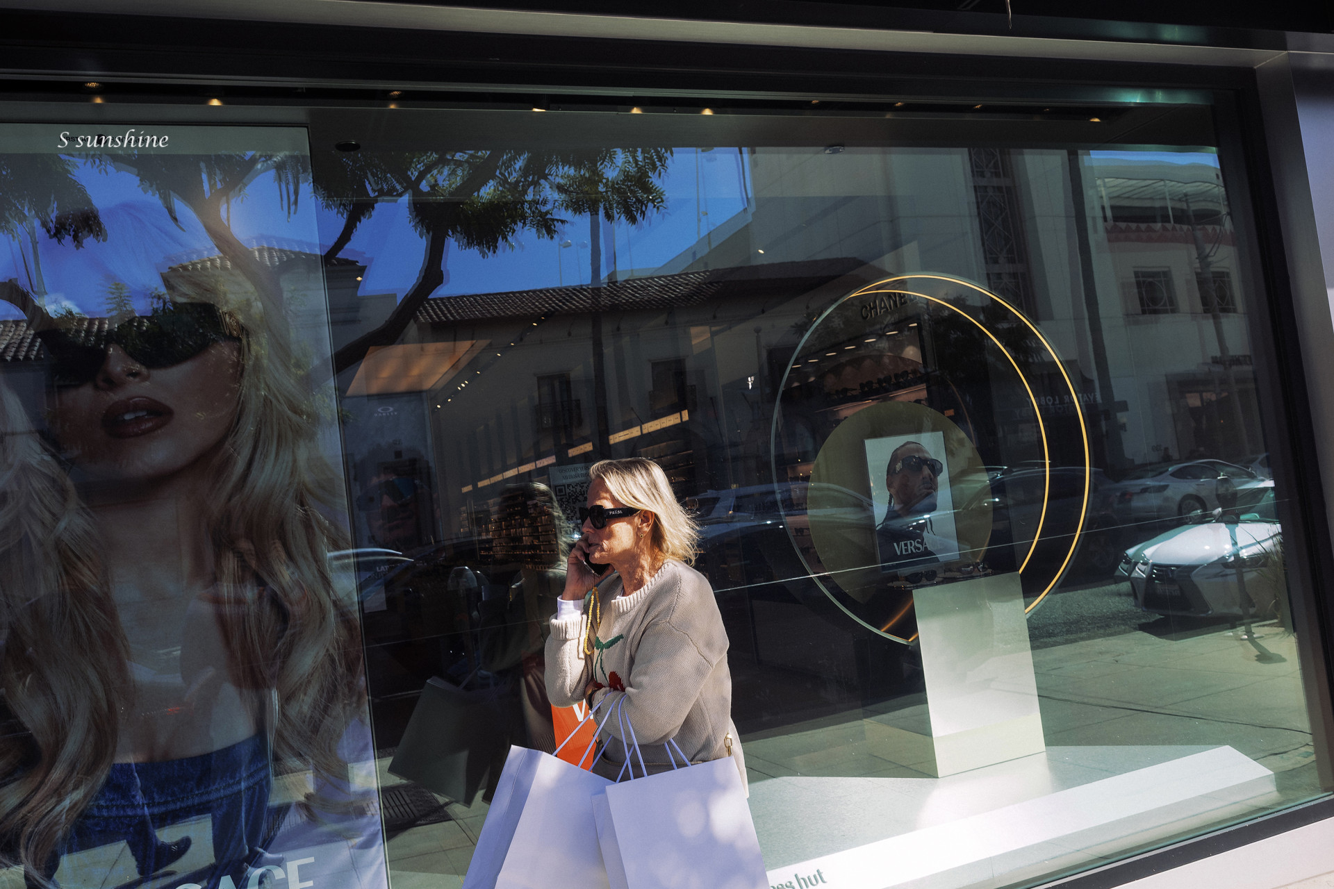 햇빛에 드러난 피부 톤과 의상, 그리고 쇼윈도우 속 인공적인 빛(원형 네온 라인) 사이의 대비가 인상적입니다.
