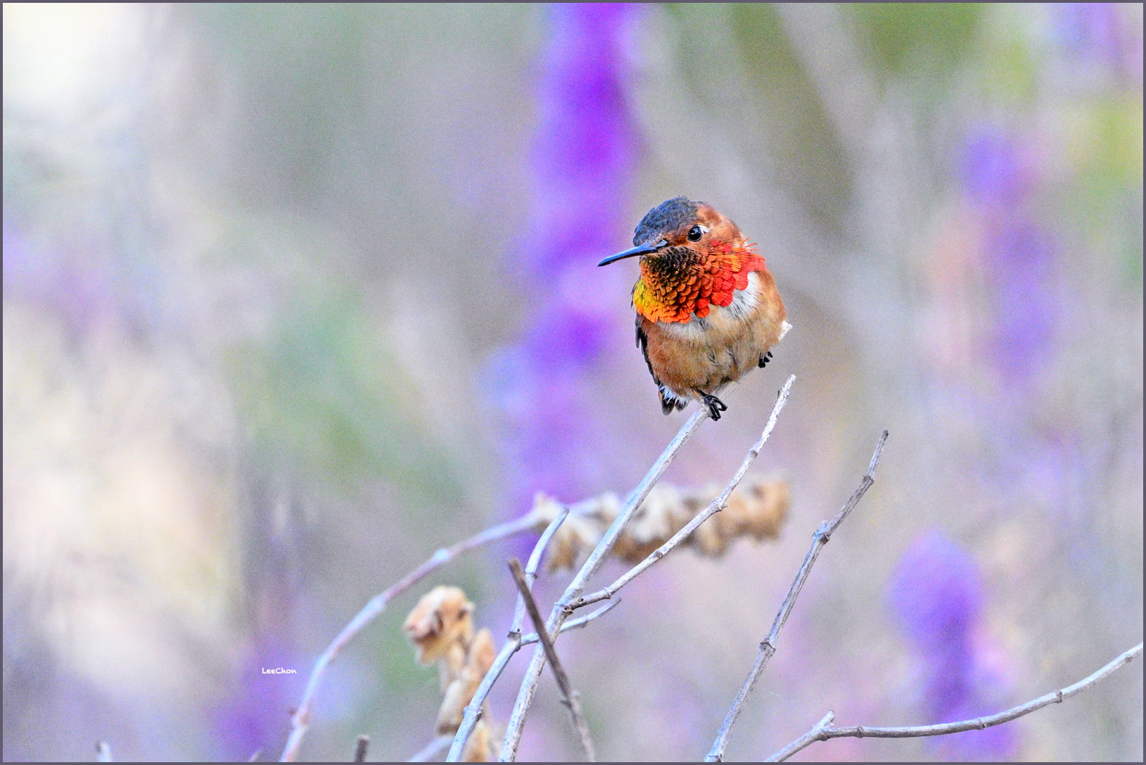 바짝 마른 가느다란 가지에 앉아 있어요