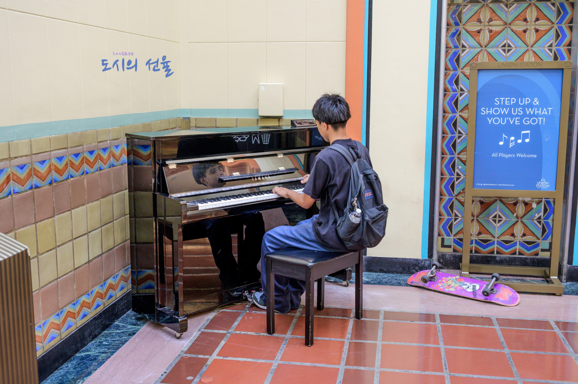 한 청소년이 유니언 스테이션 내부에 마련된 **공공 피아노(public piano)**에 앉아 연주하고 있습니다. 검은색 업라이트 피아노이며, 반사되는 피아노 표면에는 소년의 얼굴이 비치고 있어 생동감 있는 구도가 돋보입니다.