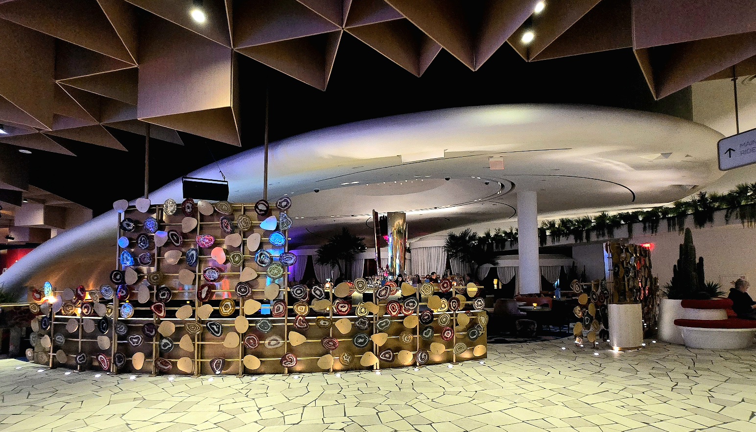 천장(삼각 패턴) + 거대한 곡면(돔/우주선 같은 형태) 위아래로 대비되면서, 한 장 안에 기하학과 유기적인 곡선이 동시에 살아 있어요.