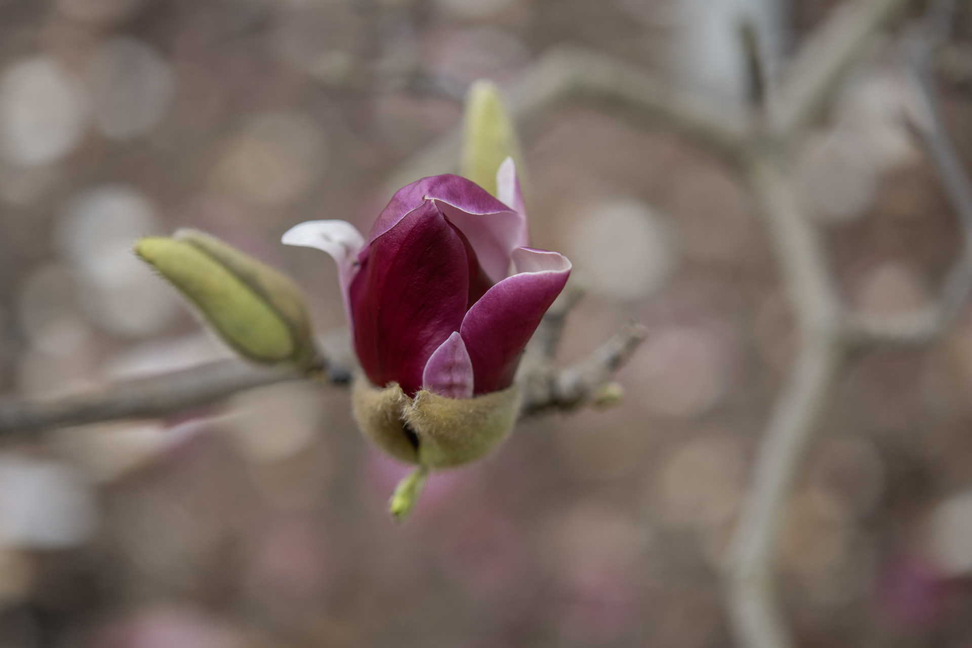 아스라히 표현된 자색 목련이 아름답습니다