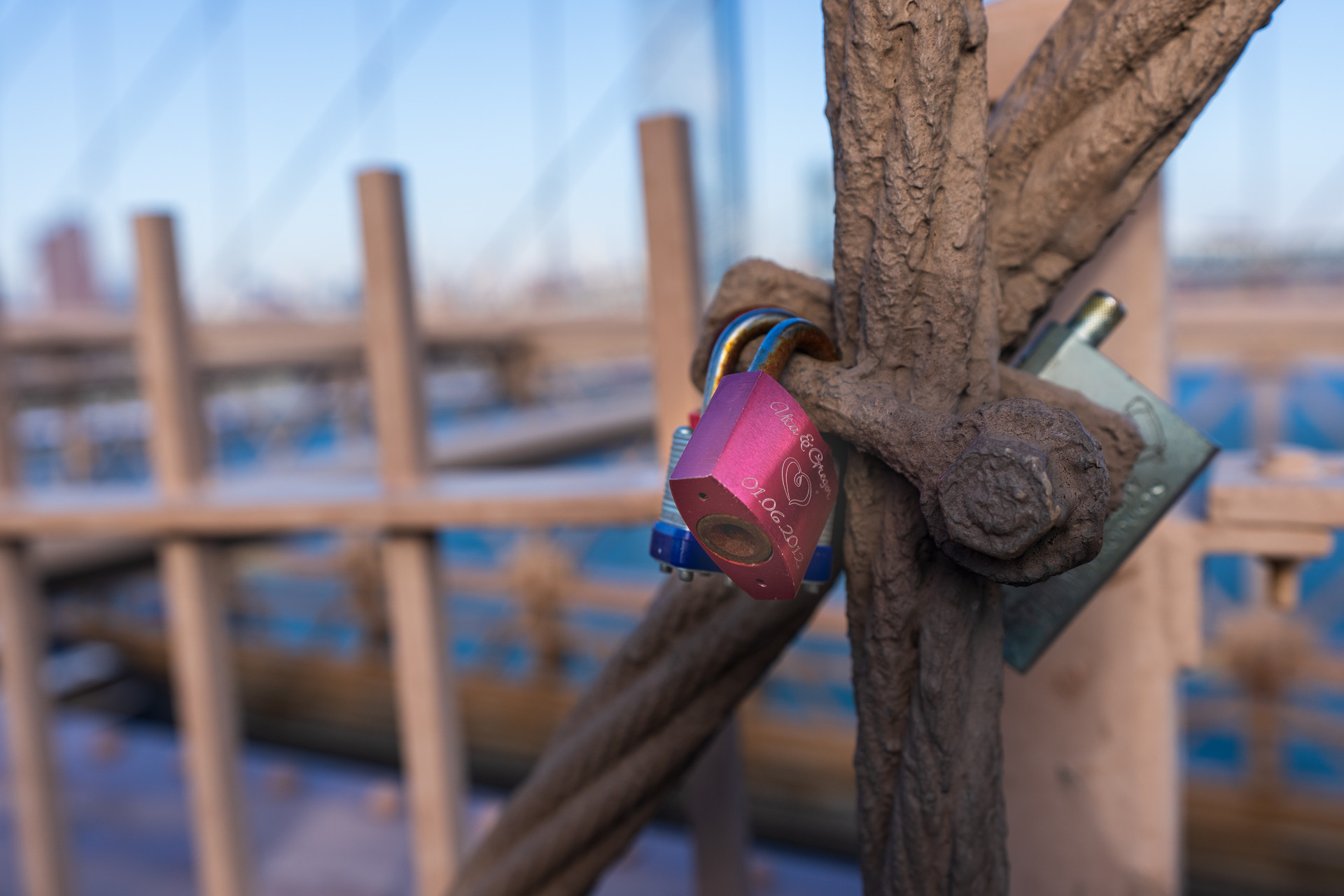 투박하고 거친 기둥에 자색 섞인 빨간색 자물쇠가 눈에 뜨이네요