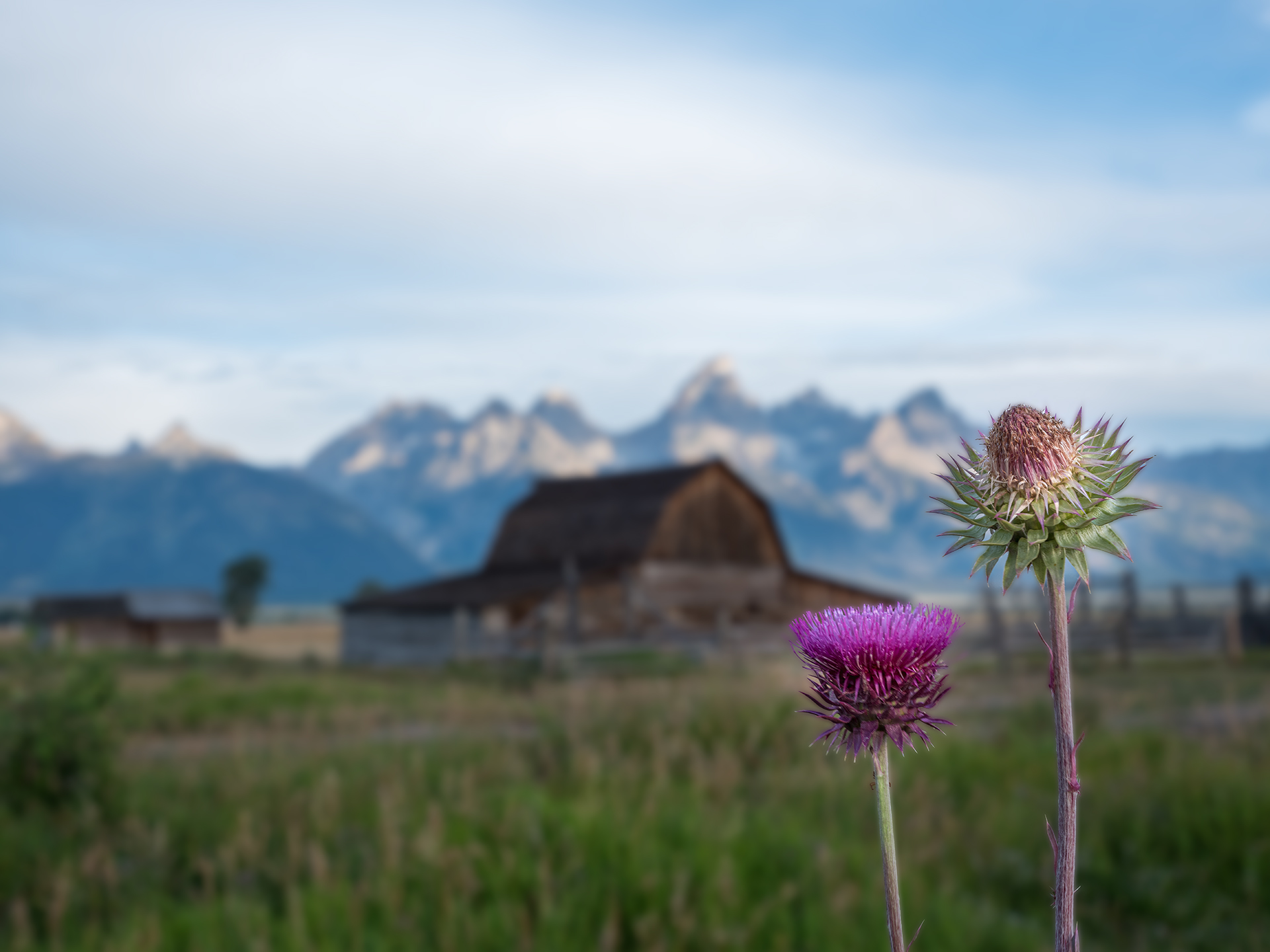 험준한 고산을 배경으로 지어진 Barns 를 뒤에 두고 홀로 핀 이름 가물가물한 민들레 닮은 억센 퍼플색깔 꽃이 용감하게 서 있군요.