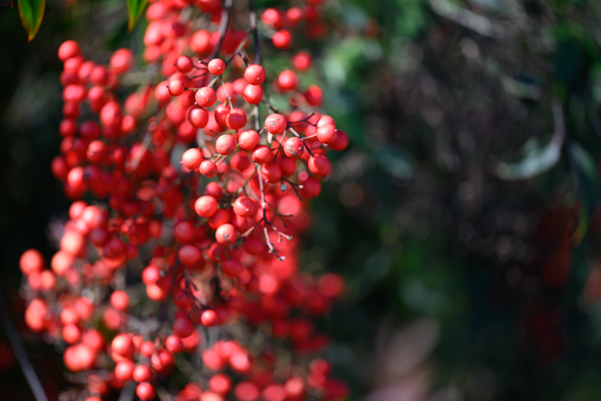 매우 흔한데 볼 때마다 렌즈 들이대고 싶은데 결과가 신통찮은 남천(南天, Nandina domestica / “heavenly bamboo”) 열매.