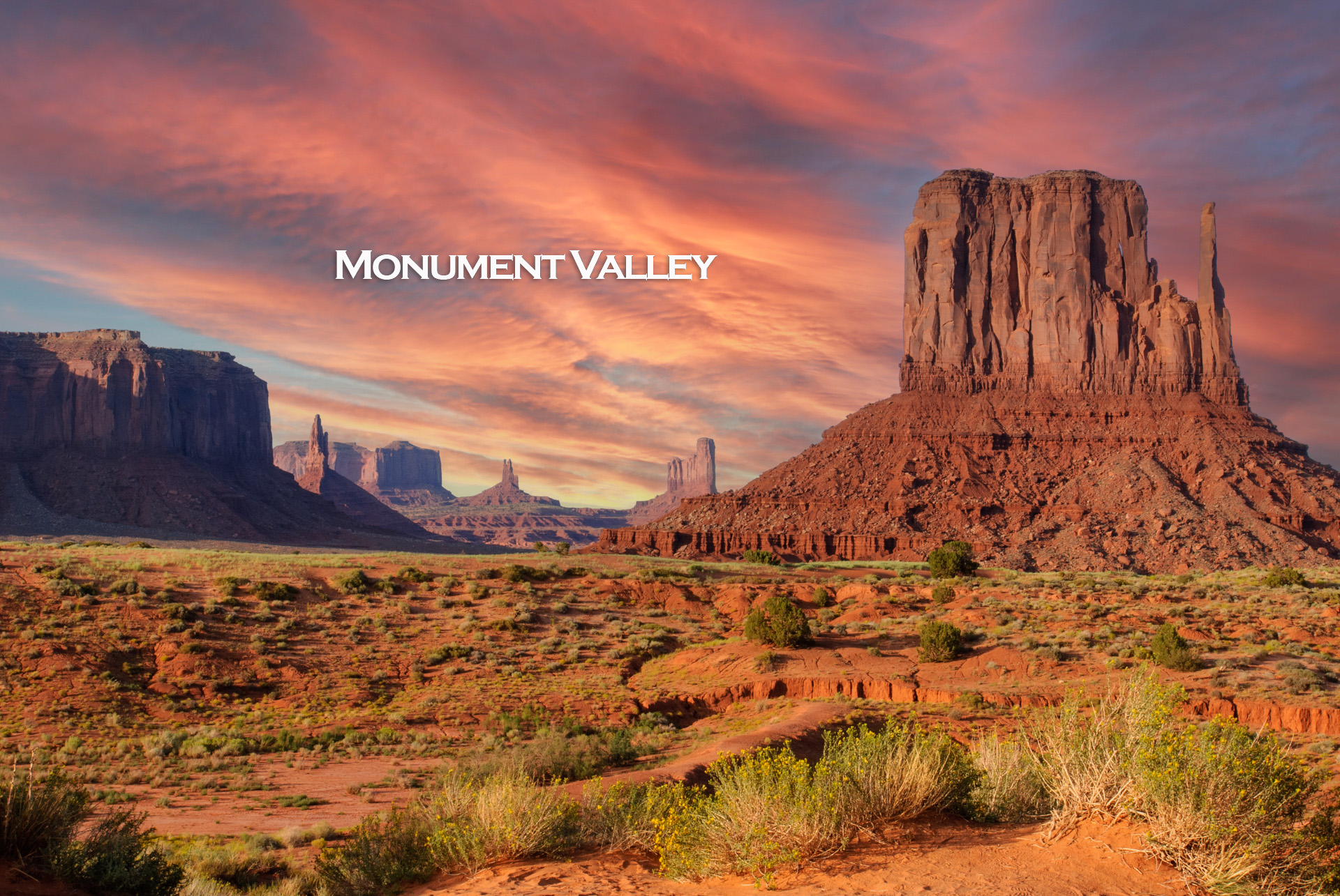 붉은 대지 위로 해 질 녘의 빛이 스며들며, Monument Valley의