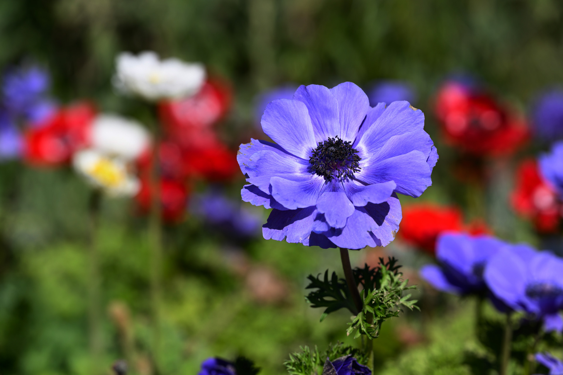 몽환적인 배경 위로 선명하게 떠오른 보라색 아네모네(Anemone) 한 송이.