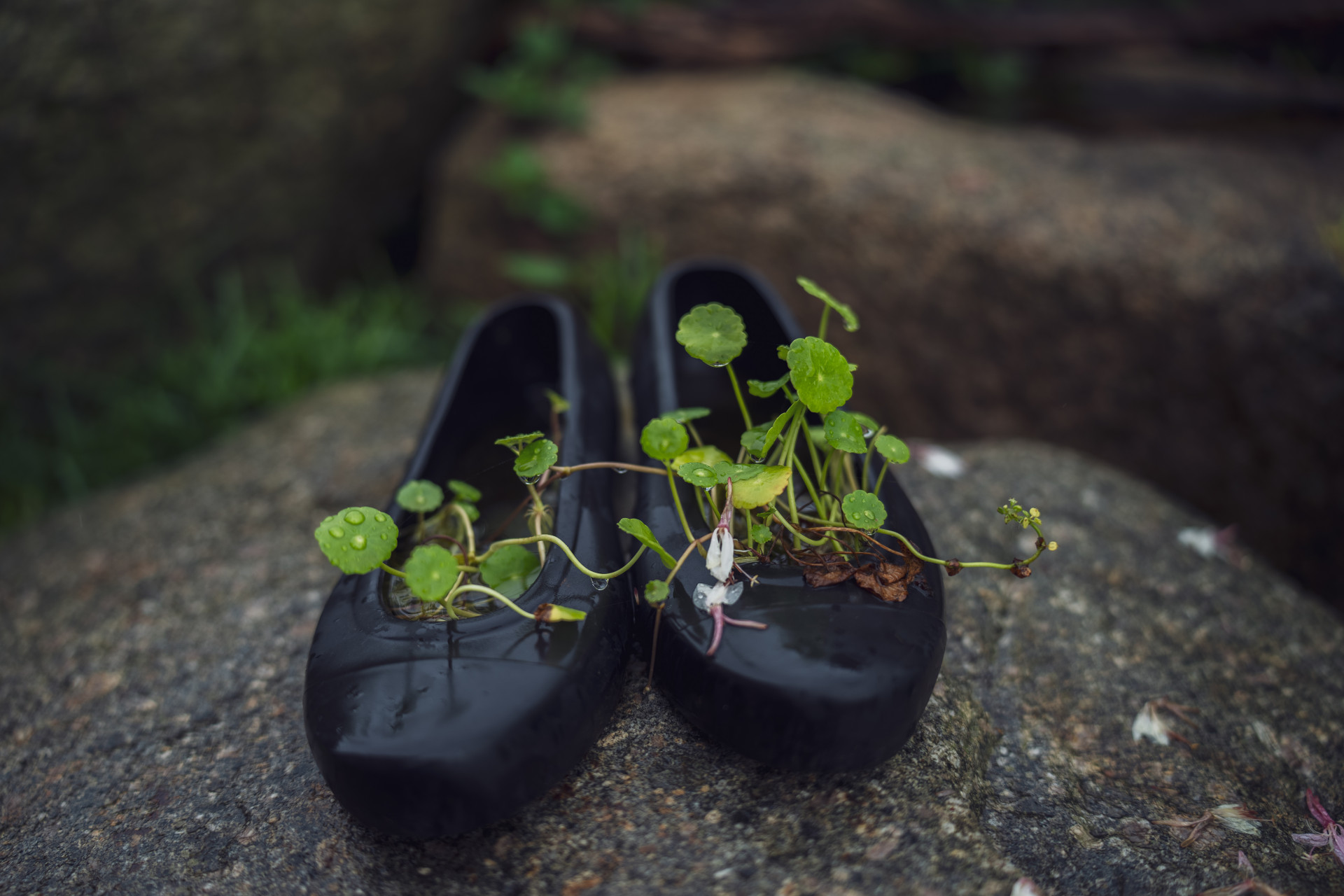 Sunnie 작성일빗물 맺힌 여린 잎 식물과 검정 고무신 화분이 이색적 입니다