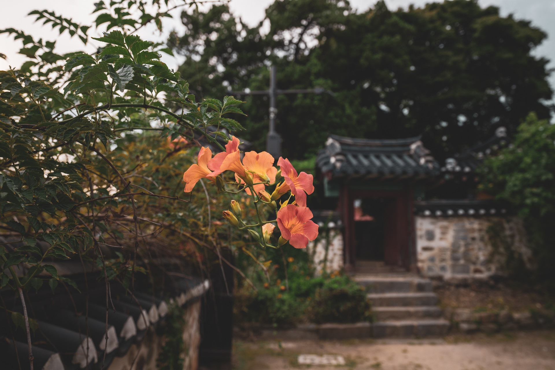 한옥 대문이 받쳐준 능소화가 마음을 정겹게 만듭니다.