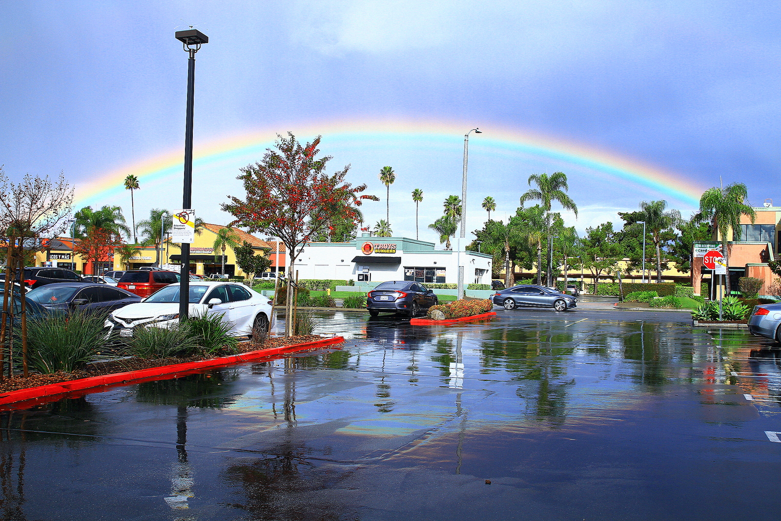 바닥이 젖은 거 보니까 한바탕 쏟아진 하늘에 선명한 무지개가 떳나봐요.