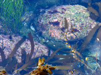 푸른 물빛 아래, 해조류가 붓질처럼 흔들리며 바위 표면을 따라 색을 입힙니다. 분홍빛이 도는 암반과 갈색 켈프..