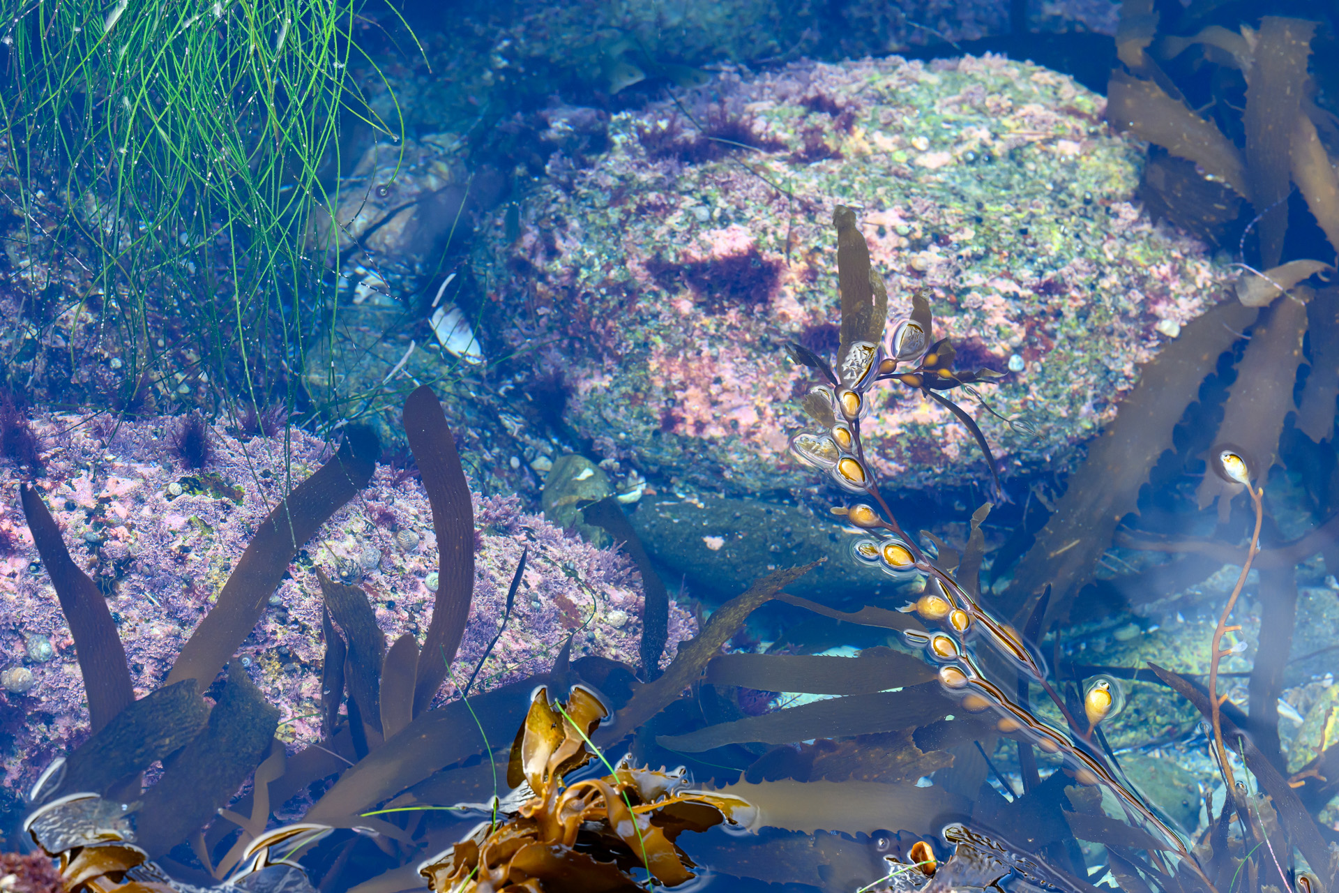 푸른 물빛 아래, 해조류가 붓질처럼 흔들리며 바위 표면을 따라 색을 입힙니다.