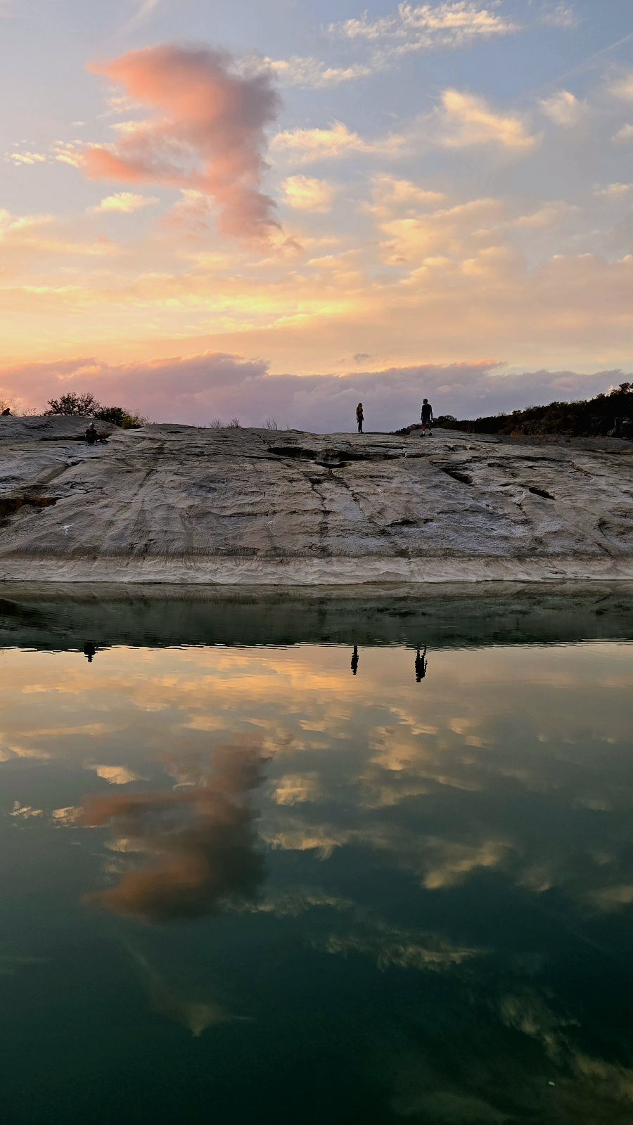파스텔 톤 노을 구름이 수면에 그대로 담기면서, 위·아래가 서로를 비추는 “거울” 같은 구조가 만들어졌네요.