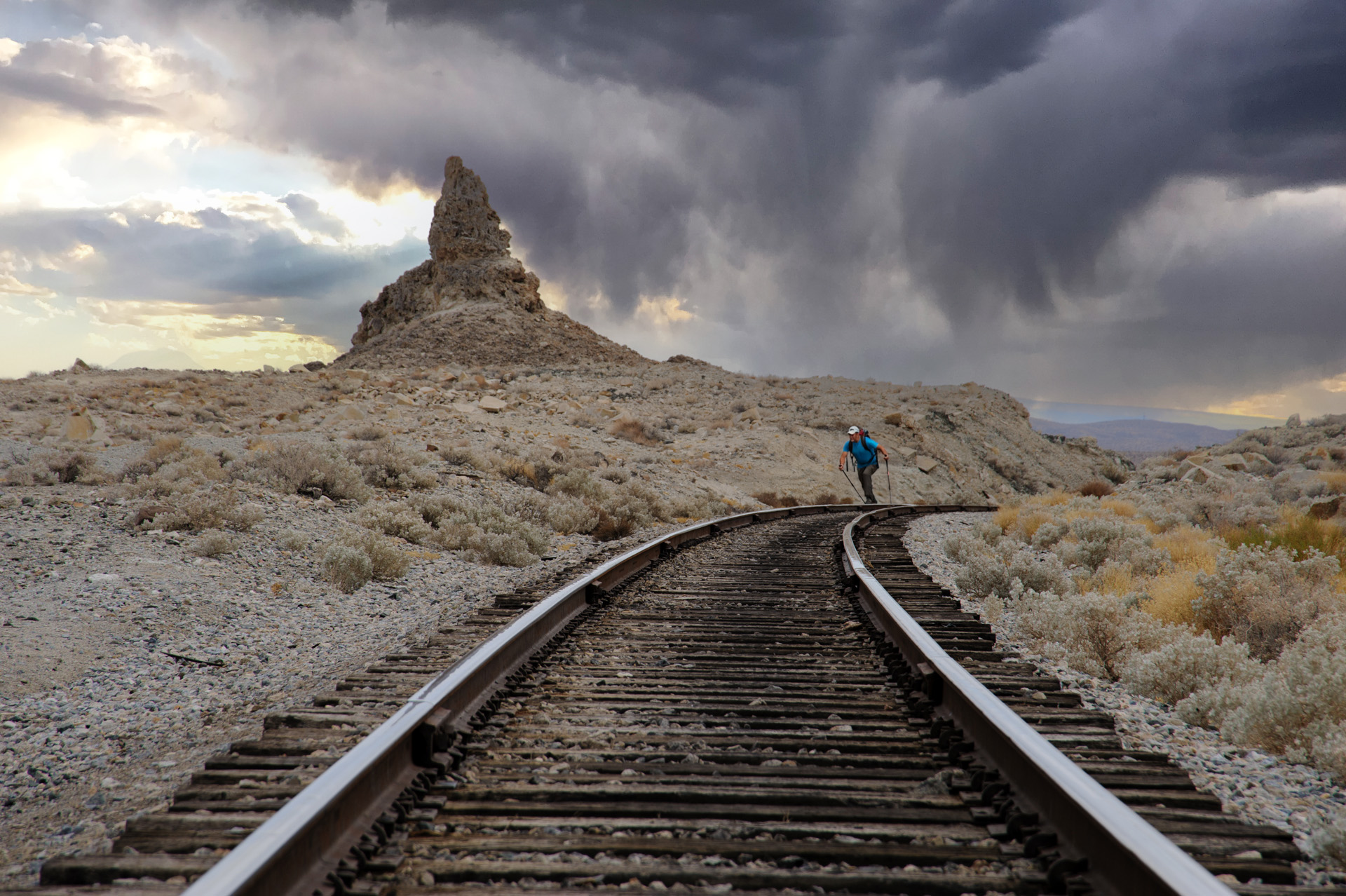 끝없이 뻗은 사막의 기찻길을 따라 걷는 여행자의 모습을 담았습니다.