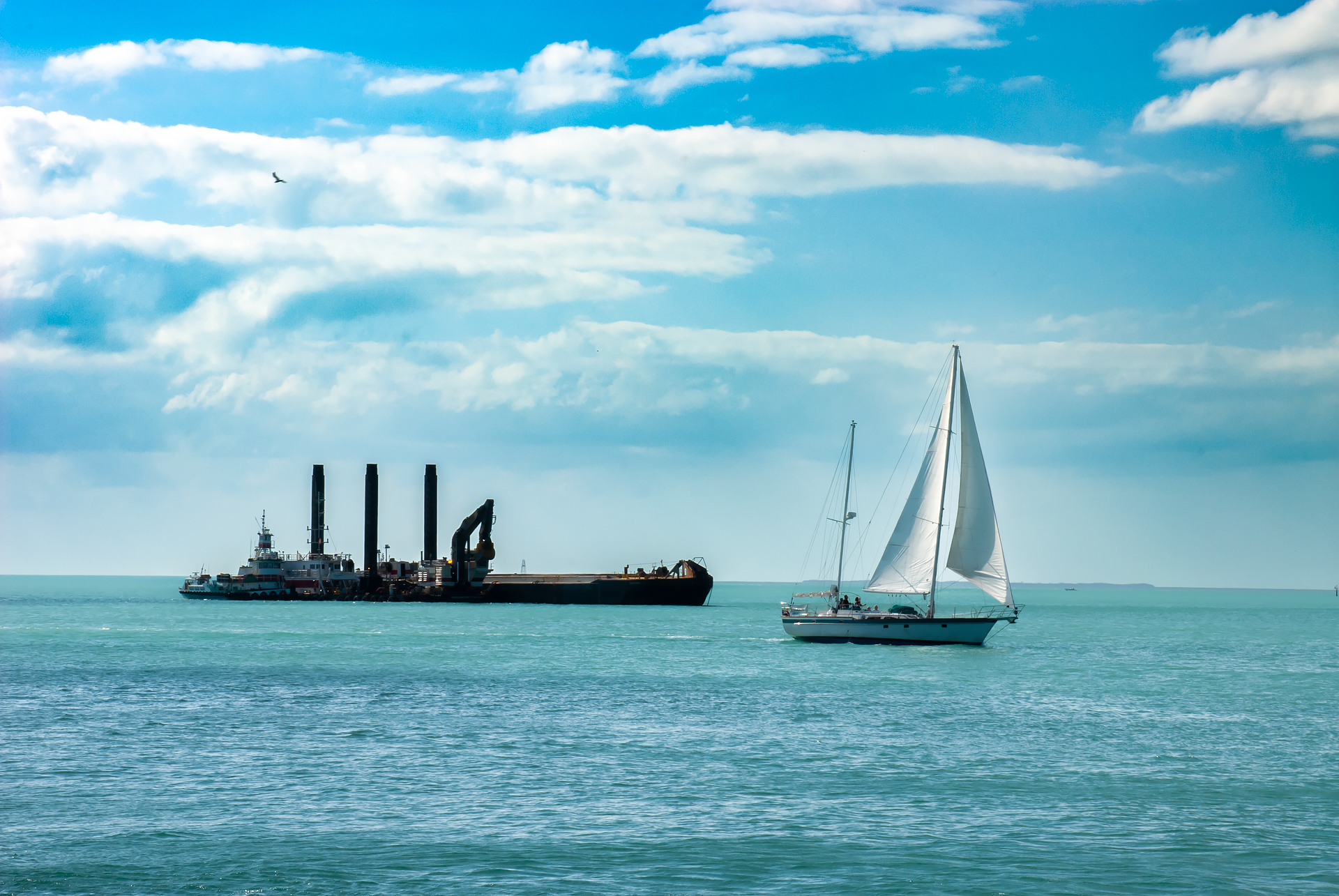 열심히 일하는 작업선 옆으로 유람 요트가 지나갑니다.