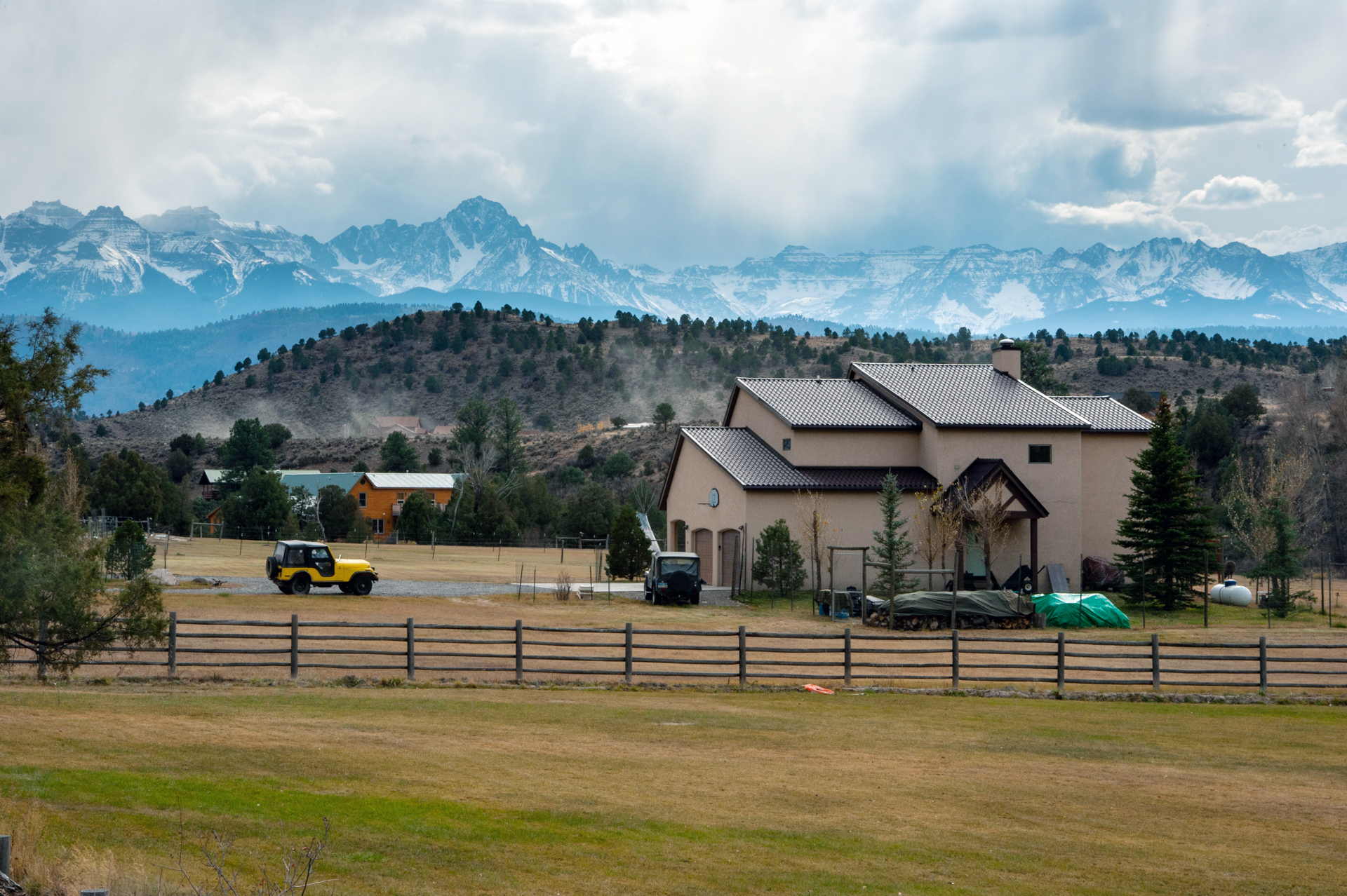 눈쌓인 배경산에 장작더미 쌓아놓은 주택의 모습이 깊은 산중 같습니다.