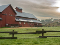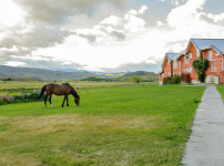 파타고니아의 넓은 초원에 말들이 흩어져 풀을 뜯고, 붉은 목장 건물이 풍경의 중심을 잡아줍니다. 언덕의 녹음과..