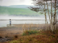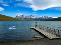 .잔잔한 호수 끝, 나무 부두 위에 선 한 아이가 두 팔을 들어 올린다. 만세~~ 칠레 파타고니아의 설산과 푸른 하늘이 ..
