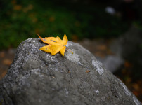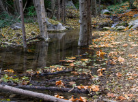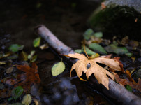 가지 위에 잠시 걸린 낙엽 하나. 흐르는 물은 조용히 시간을 데려갑니다.