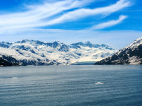 새하얀 산맥과 빙하가 수평선까지 이어지고, 잔잔한 바다 위에는 작은 유빙이 떠 있습니다. 길게 뻗은 구름결과 깊은 푸른빛이..