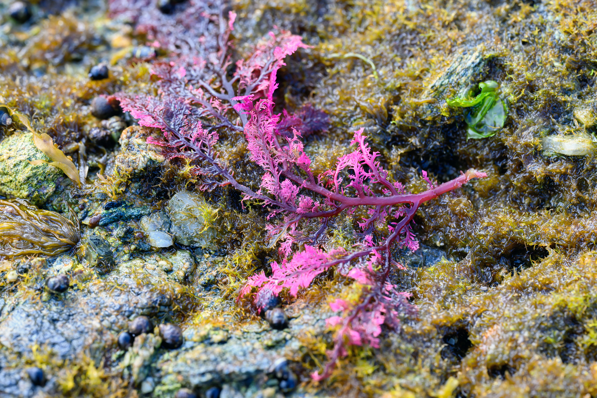 바위 표면을 따라 뻗은 붉은 해조는 조간대의 혈관처럼 공간을 가로지른다.