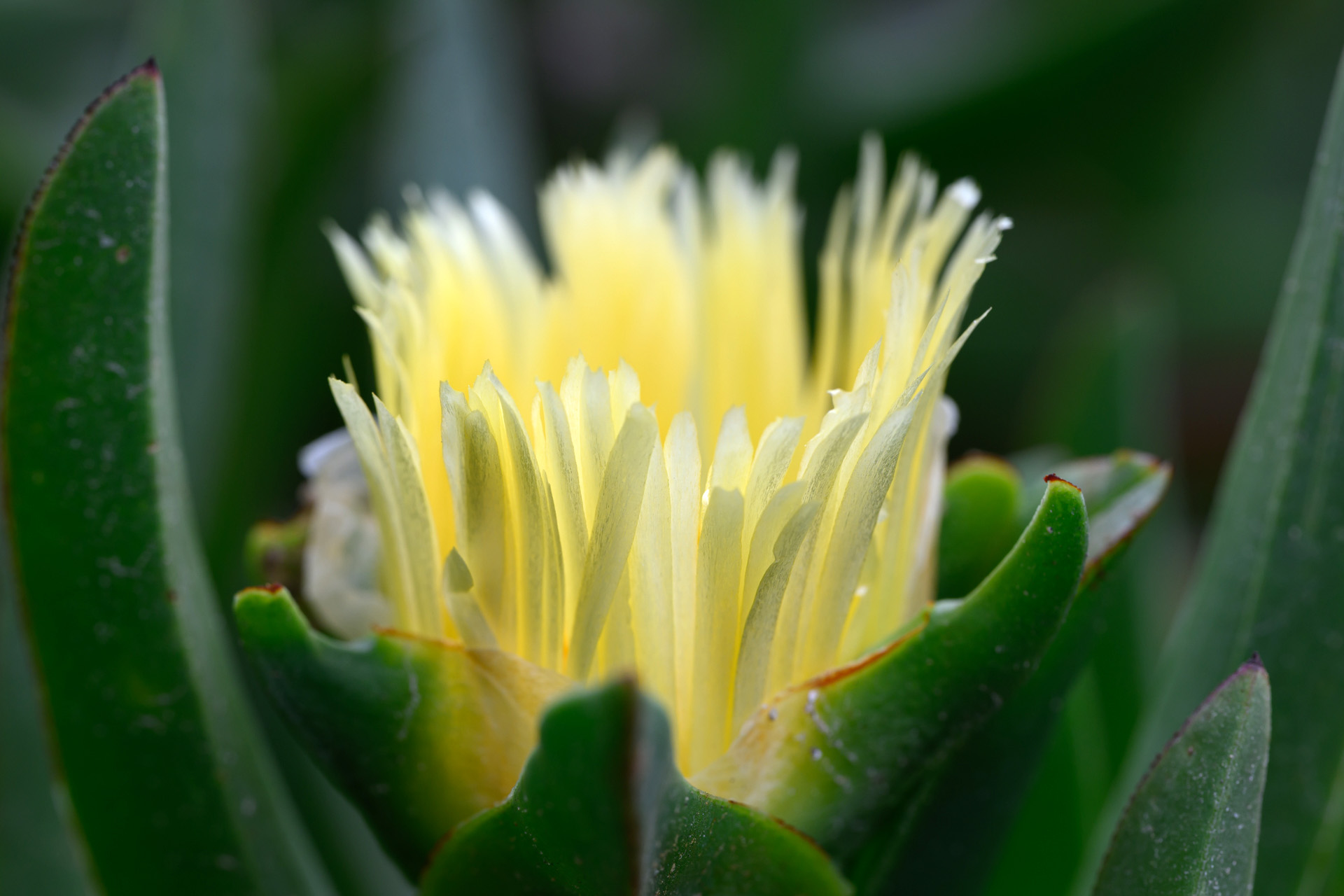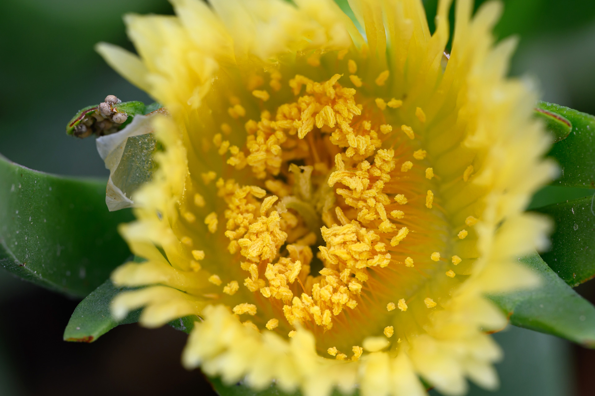 두툼한 잎 사이에서 터져 나오듯 피어난 노란 꽃. 거친 환경에서도 빛을 향해 피어나는 생명의 강인함과 섬세한 구조를 매크로로 담아냈다.