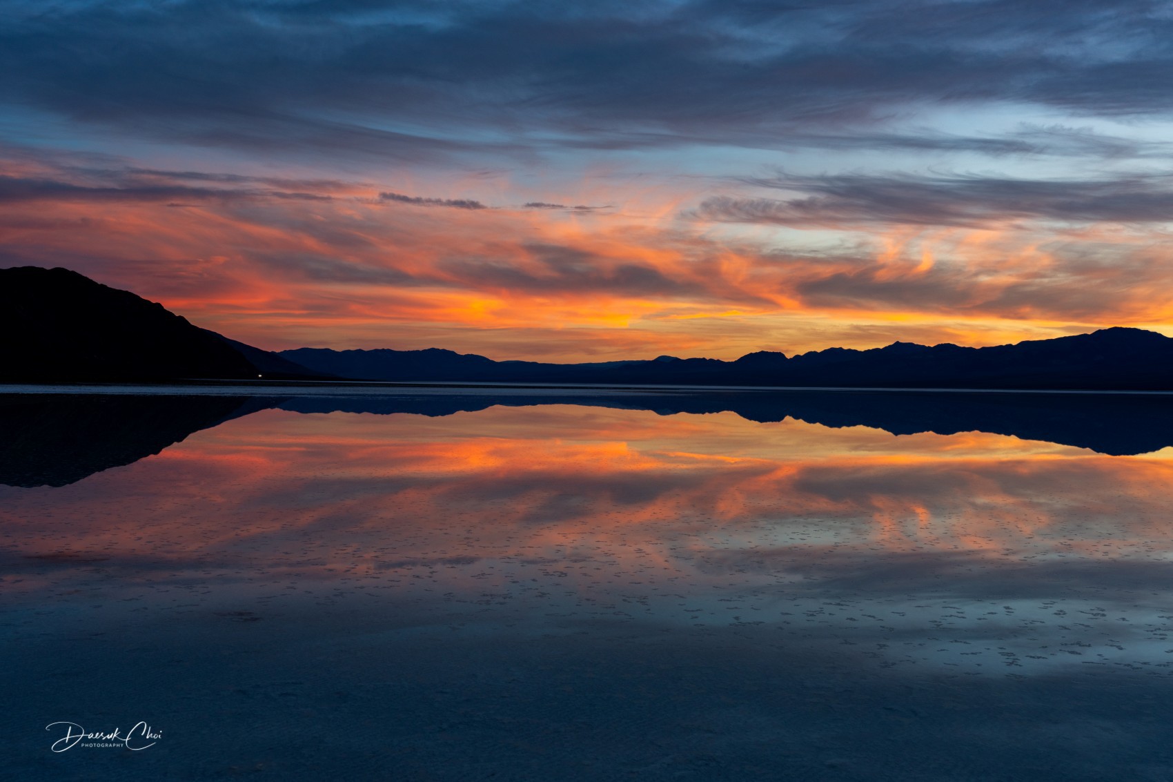 하늘만 아름다운 것이 아니라, 그 하늘이 물 위에 거의 완벽하게 번져 내려오면서 장면 전체를 두 배로 확장합니다.