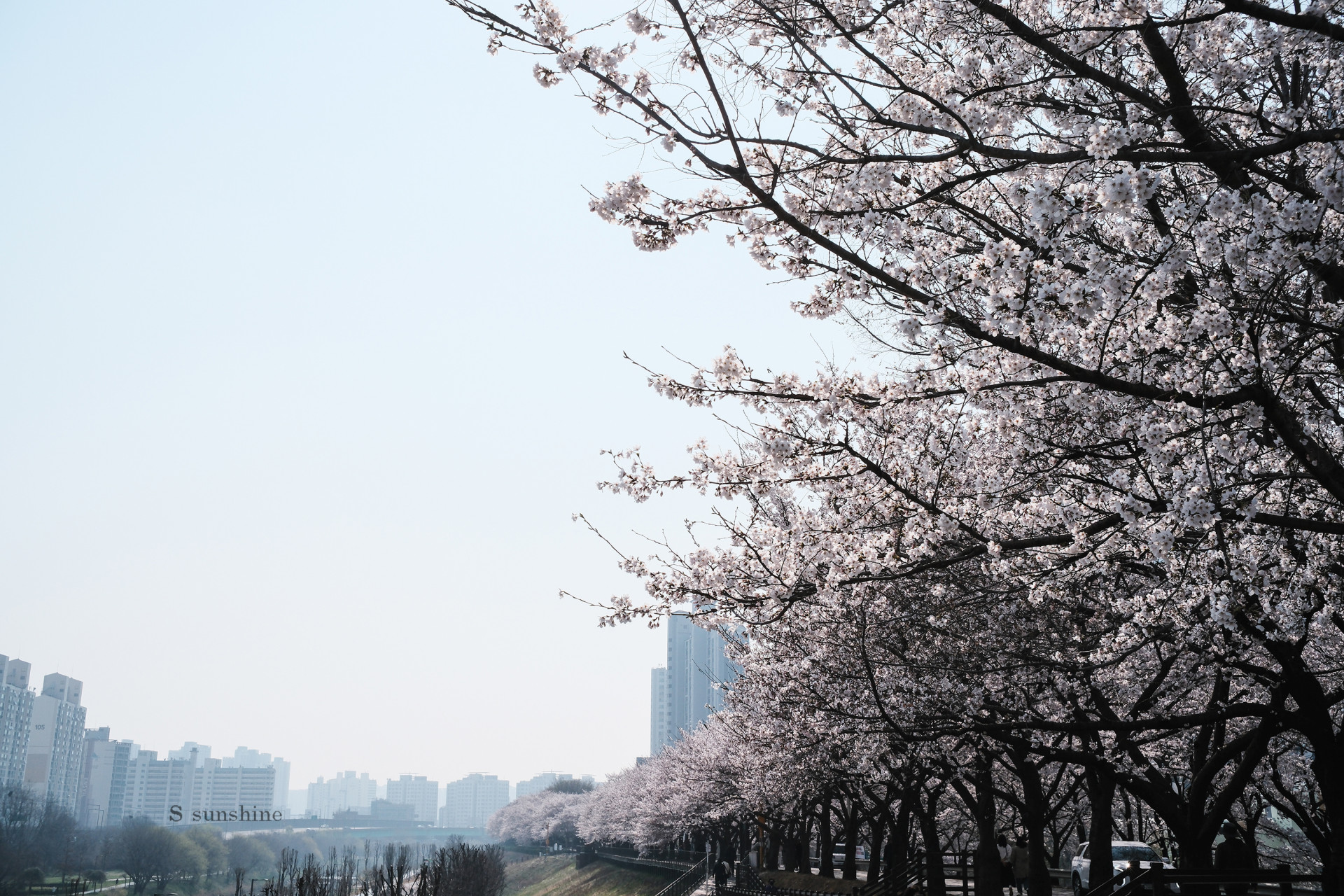 멀리 보이는 아파트 실루엣과 가까운 벚꽃의 대비도 좋습니다.