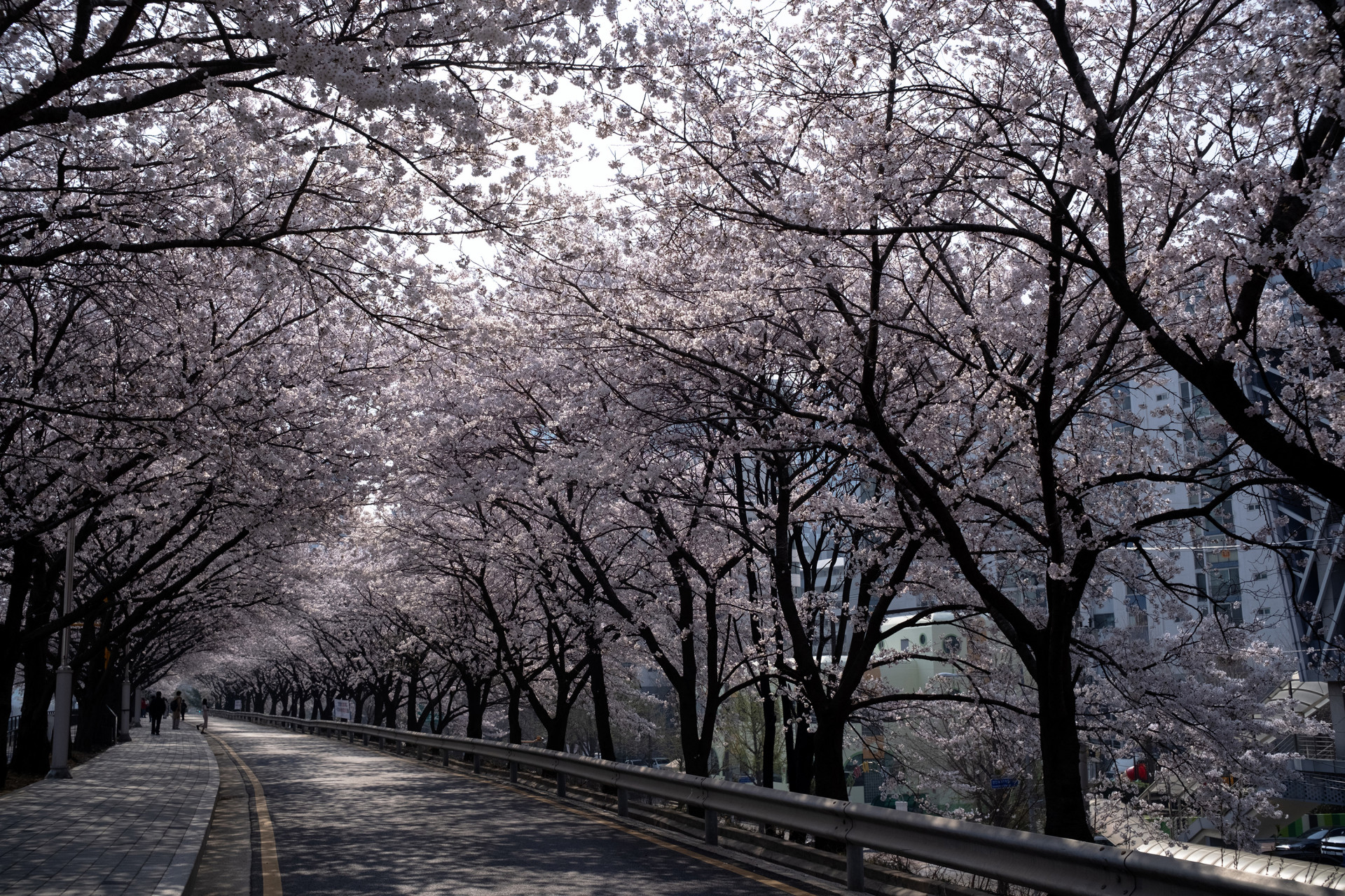 화사함을 일부러 절제하고, 약간의 안개감과 낮은 채도로 톤을 눌러서 도시의 풍경과 벚꽃이 하나로 어우러집니다.