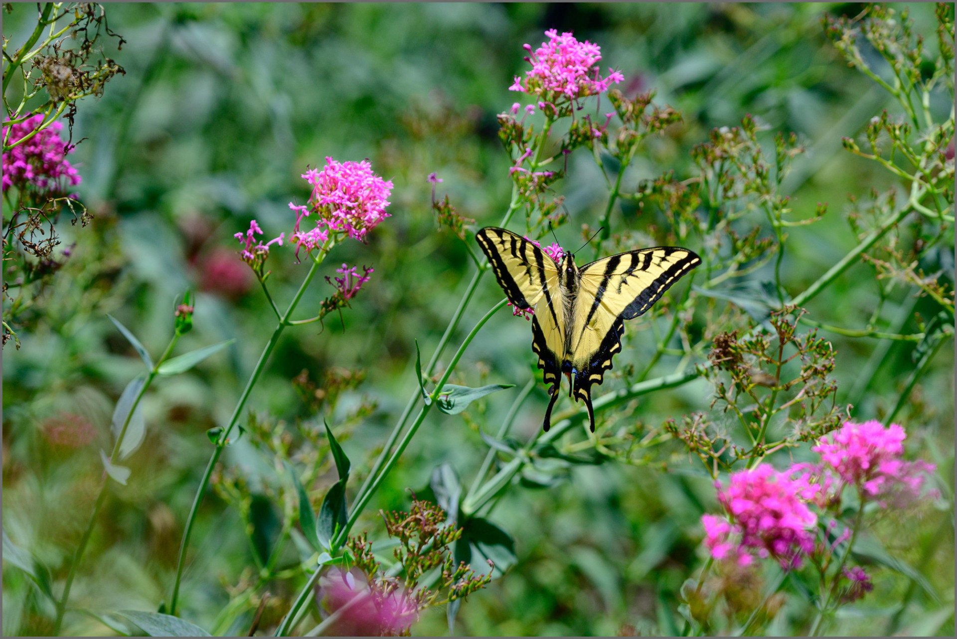 참고로, 이 종은 **Eastern Tiger Swallowtail (Papilio glaucus)**과 비슷하게 생겼지만, 사진에 보이는 것은 날개의 무늬나 서식지로 보아 Western Tiger Swallowtail이 맞습니다.